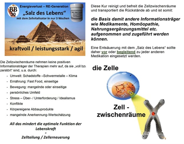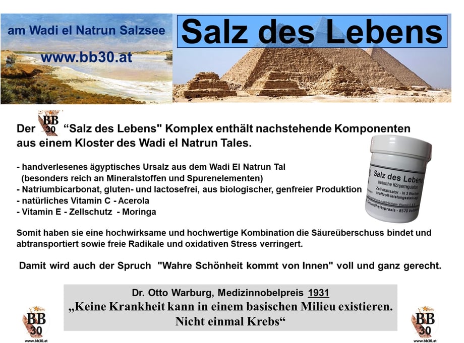 Der "BB30 Salz des Lebens" Komplex enthält nachstehende Komponenten aus einem Kloster des Wadi el Natrun Tales. - handverlesenes ägyptisches Ursalz aus dem Wadi El Natrun Tal (besonders reich an Mineralstoffen und Spurenelementen) - Natriumbicarbonat, gluten- und lactosefrei, aus biologischer, genfreier Produktion - natürliches Vitamin C - Acerola - Vitamin E - Zellschutz